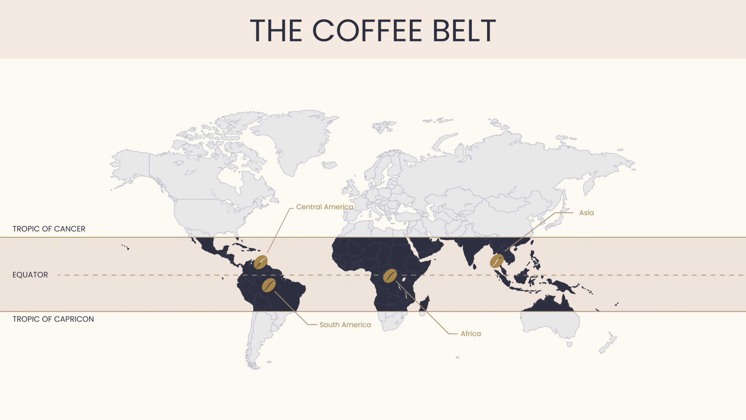 Coffee begins its journey from the coffee plant, a tropical shrub thriving in regions with the ideal balance of temperature, rainfall, and altitude. These coffee-growing regions are situated along the bean belt—a zone encircling the earth between the Tropics of Cancer and Capricorn. Each region delivers distinct flavors influenced by climate and soil, known as terroir.